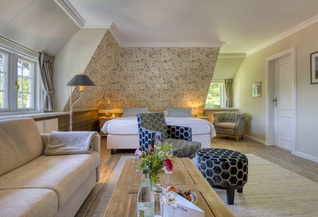 Von den Zimmern und Suiten im Obergeschoss haben Sie einen wunderbaren Blick auf die reetgedeckten Friesenhäuser oder auf den Garten.