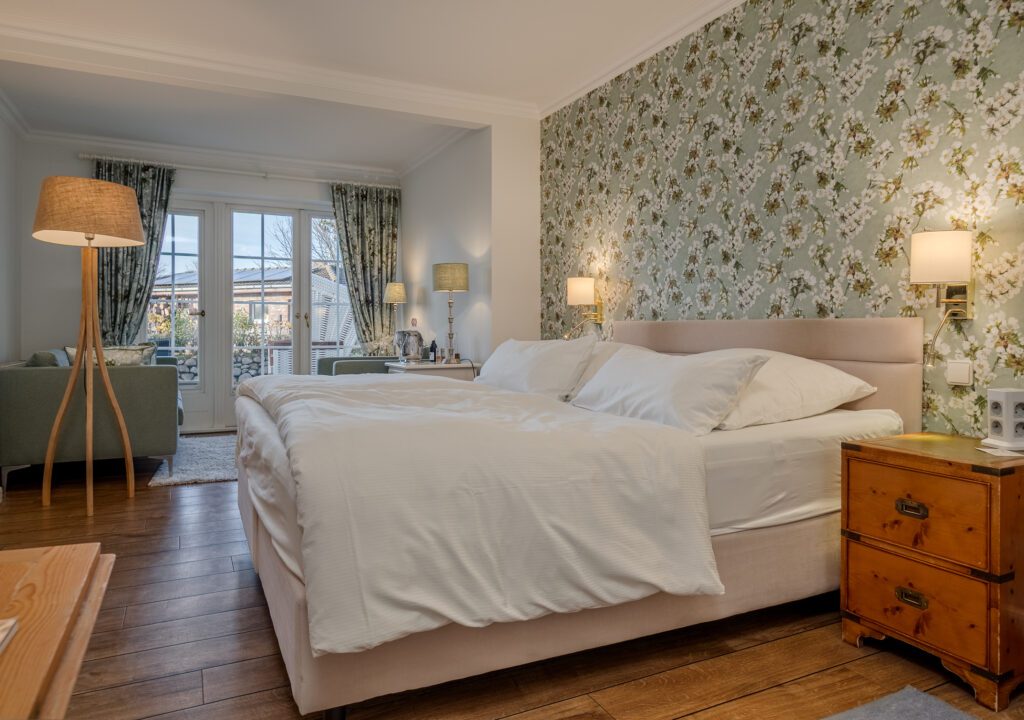 Dieses lichtdurchflutete Doppelzimmer verfügt über eine Terrasse mit eigenem Strandkorb. Hier werden Sie von der Morgensonne geweckt und genießen den ganzen Tag die Sonne und den Blick in den weitläufigen Hortensiengarten.